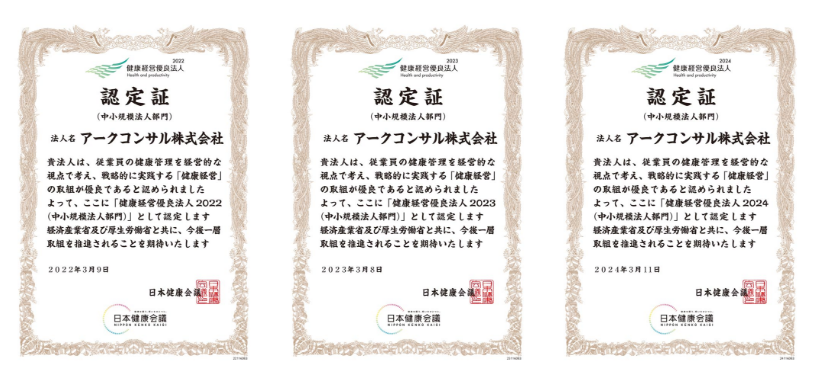 アークコンサル株式会社は、2022年から2024年まで3年連続で「健康経営優良法人(中小規模法人部門)」に認定されました。従業員の健康を経営の柱とし、心身ともに活力あふれる職場づくりを推進しています。